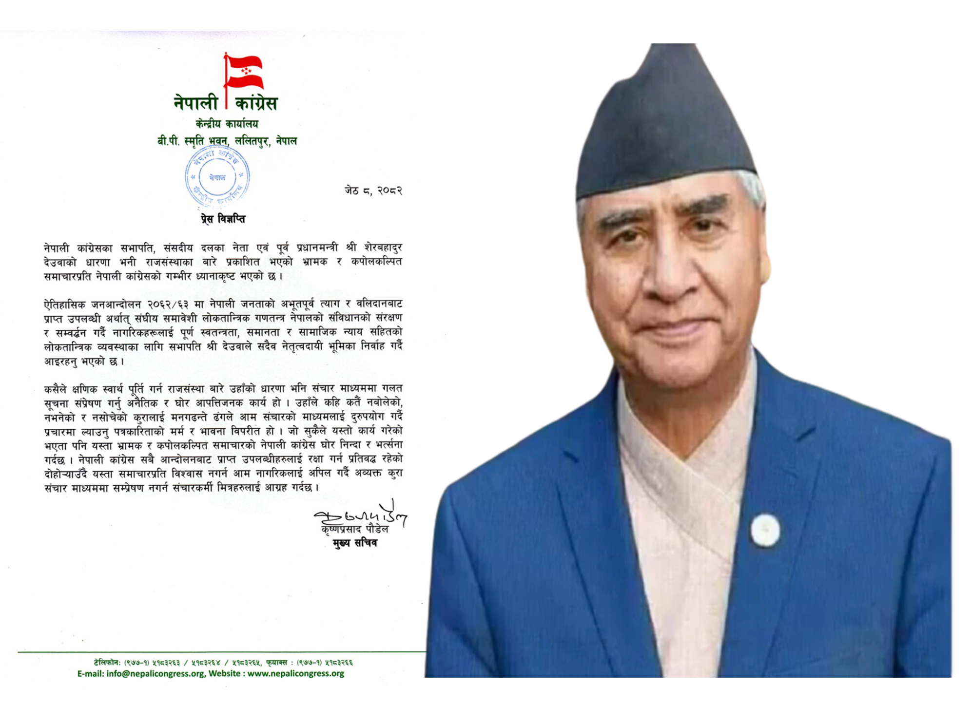 कसैले क्षणिक स्वार्थ पूर्ति गर्न राजसंस्था बारे उहाँको धारणा भनि संचार माध्यममा गलत सूचना संप्रेषण गर्नु अनैतिक र घोर आपत्तिजनक कार्य हो । उहाँले कहि कतैं नबोलेको, नभनेको र नसोचेको कुरालाई मनगढन्ते ढंगले आम संचारको माध्यमलाई दुरुपयोग गर्दै प्रचारमा ल्याउनु पत्रकारिताको मर्म र भावना विपरीत हो । जो सुकैले यस्तो कार्य गरेको भएता पनि यस्ता भ्रामक र कपोलकल्पित समाचारको नेपाली कांग्रेस घोर निन्दा र भत्र्सना गर्दछ । नेपाली कांग्रेस सबै आन्दोलनबाट प्राप्त उपलब्धीहरुलाई रक्षा गर्न प्रतिवद्ध रहेको दोहोर्याउदै यस्ता समाचारप्रति विश्वास नगर्न आम नागरिकलाई अपिल गर्दै अव्यक्त कुरा संचार माध्यममा सम्प्रेषण नगर्न संचारकर्मी मित्रहरुलाई आग्रह गर्दछ भन्दै बिज्ञप्ति जारी गरेका छन्।